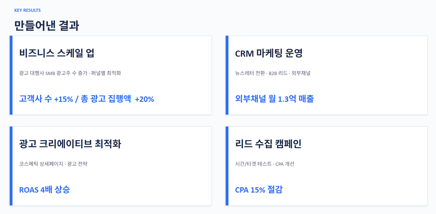 "정교한 CRM 마케팅과 퍼널별 크리에이티브 최적화를 통해 신규 리드 획득 단가(CPA)를 15% 절감하고 ROAS를 4배 상승시켰습니다. 이를 통해 고객사 수를 15% 확장하고 외부 채널 월 매출 1.3억 원을 창출하며 성공적인 비즈니스 스케일업을 증명했습니다."