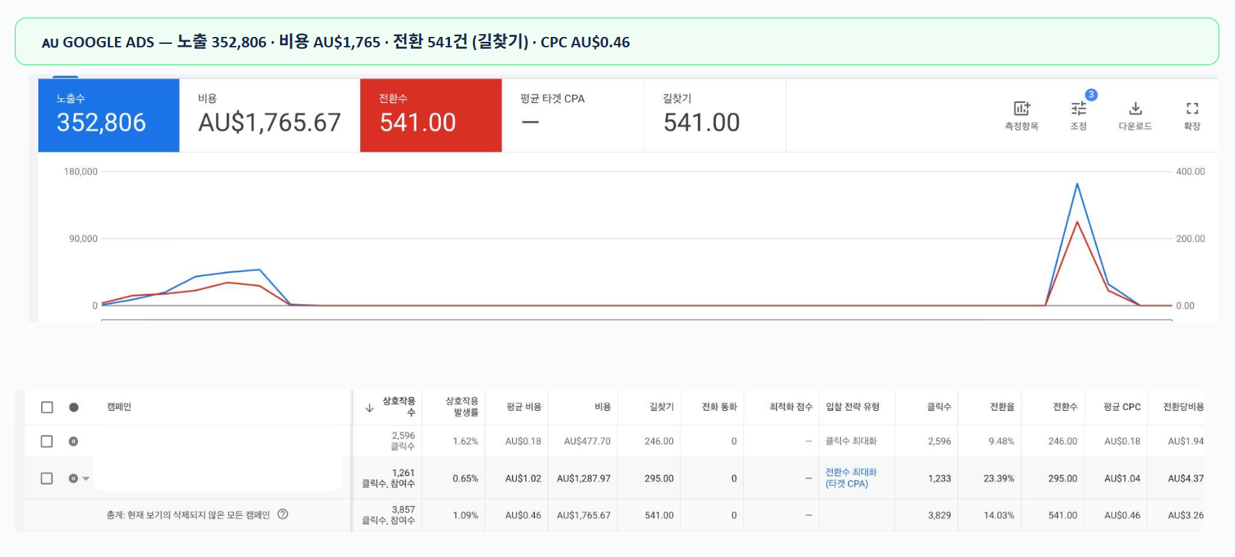 클릭당 비용 최적화 및 541건 전환