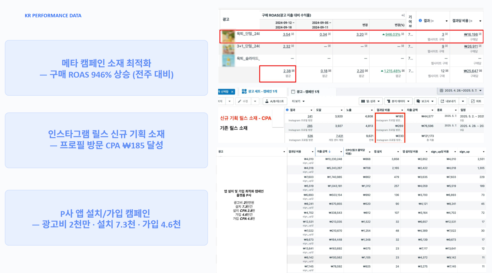"데이터 기반의 매체 믹스와 지속적인 소재 A/B 테스트를 통해 불필요한 광고비 누수를 완벽히 차단하고, ROAS 946%라는 폭발적인 비용 대비 수익률을 기록했습니다."